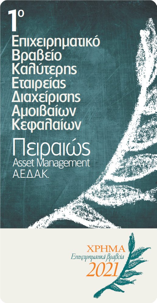 H Πειραιώς Asset Management Α.Ε.Δ.Α.Κ. στην 19η διοργάνωση του θεσμού «Επιχειρηματικά Βραβεία ΧΡΗΜΑ 2021» διακρίθηκε με το 1ο βραβείο στην κατηγορία Καλύτερη εταιρεία διαχείρισης αμοιβαίων κεφαλαίων - 2021: 1ο βραβείο