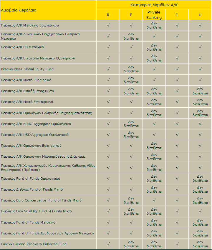 - Κατηγορία μεριδίων Ρ: διατίθεται αποκλειστικά στους επενδυτές που αποκτούν συμμετοχή στο Αμοιβαίο Κεφάλαιο μέσω του δικτύου διανομής «Private Banking» της Διαμεσολαβήτριας στη διάθεση μεριδίων του Αμοιβαίου Κεφαλαίου Τράπεζας Πειραιώς Α.Ε.,
